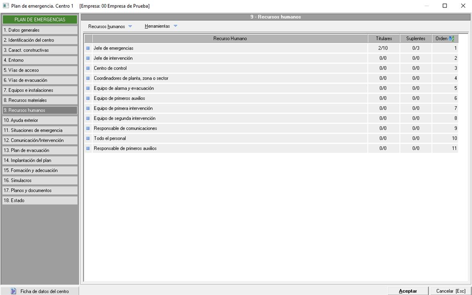 Si anteriormente gestionábamos los recursos materiales, en este caso lo haremos con los recursos humanos (personal cualificado y encargado de la gestión en caso de evacuación) en una pestaña similar a la siguiente imagen: