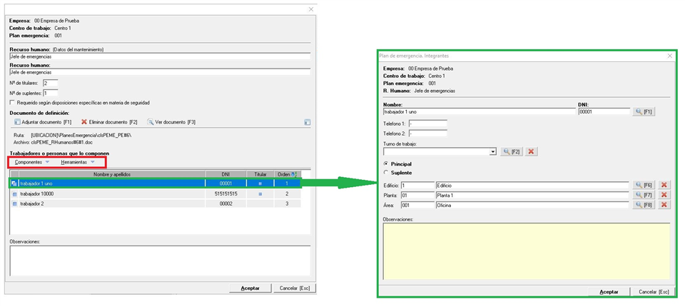 A la izquierda tenemos la ventana que se nos muestra, donde se indica el nombre en dos campos, el primero según el mantenimiento (no editable) y el segundo si nos permite modificarlo. Seguidamente indicaremos la cantidad de personas existentes como titulares y suplentes y si es requerido según disposiciones específicas en materias de seguridad. Podemos añadir un documento sobre la definición del recurso (el mismo que se indica en el mantenimiento). En la parte inferior, desde el desplegable Componentes (resaltado en rojo) podemos añadir a los trabajadores (ya sean del mismo centro, de otro centro o crear uno nuevo). Al crearlo se mostrará la misma ventana que se muestra al hacer doble clic en uno existente (la que vemos en la parte derecha de la imagen superior resaltada en verde). En esta ventana nos traerá o indicaremos, en caso de ser uno nuevo, el nombre, DNI, teléfonos de contacto y turno de trabajo. Debemos indicar si esa persona va a ser uno de los titulares o suplente y, seguidamente, indicaremos la ubicación de la misma (edificio, planta y sección). Por último, en el desplegable Herramientas (resaltado en rojo) disponemos de opciones masivas para establecer, a los trabajadores seleccionados, si son titulares o suplentes, el turno de trabajo y la ubicación.