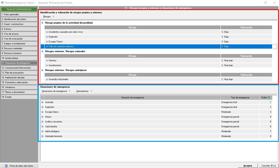 En esta pestaña registraremos los riesgos existentes para poder valorarlos y las situaciones de emergencia que pueden darse. La pantalla que se muestra es similar a la siguiente imagen: