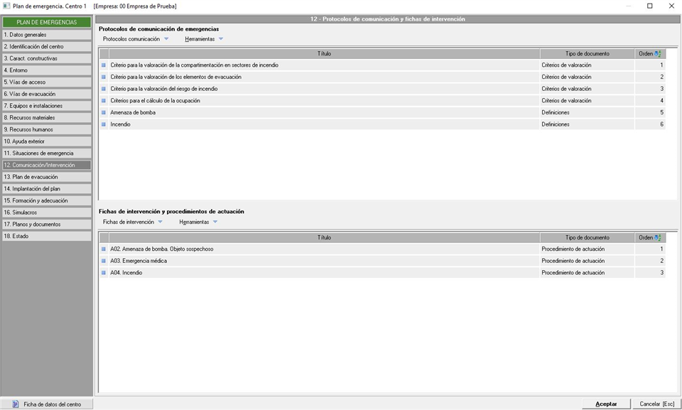 En esta pestaña indicaremos los protocolos de comunicación así como las fichas de intervención y procedimientos de actuación desde el mantenimiento de la biblioteca de emergencias o directamente en el propio plan de emergencias/autoprotección. La ventana que aparece es similar a la siguiente imagen: