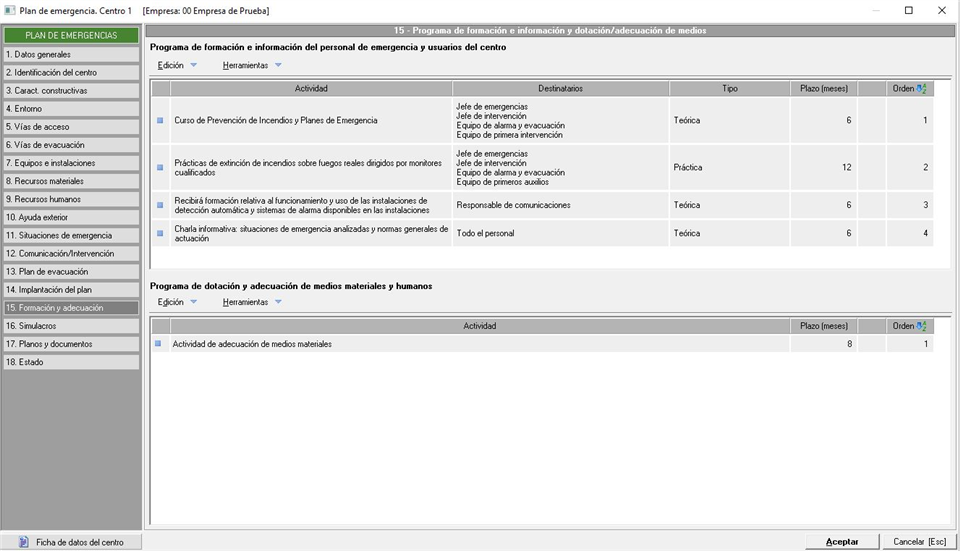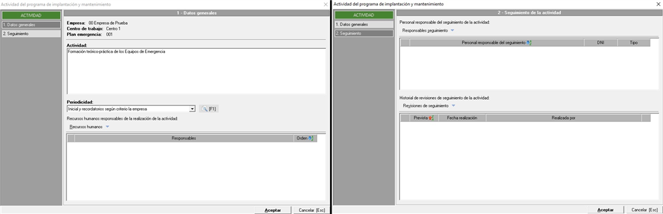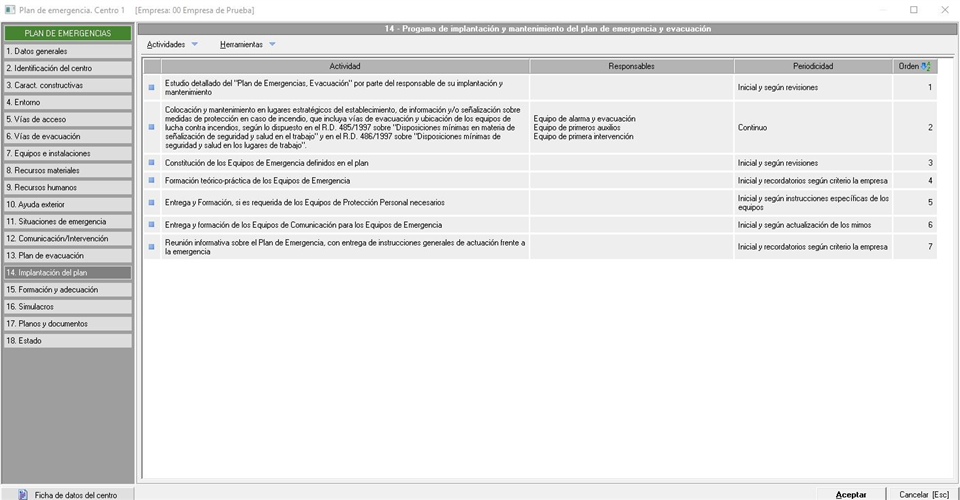 En esta pestaña indicaremos las actividades que se van a realizar para la implantación del plan de emergencia. Se nos muestra en una ventana similar a la siguiente imagen: