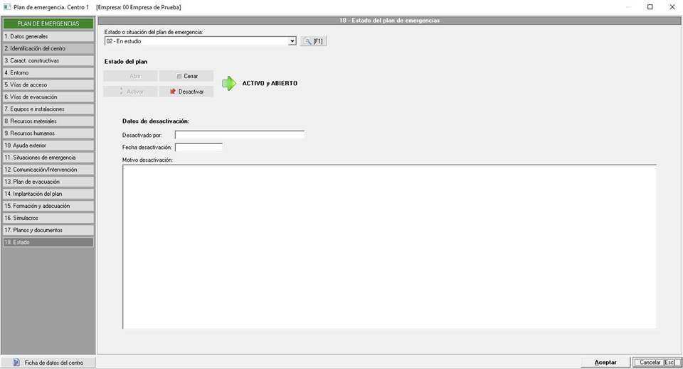 Sobre los estados, debemos tener en cuenta que un Plan de Emergencias/Autoprotección puede estar Abierto porque se está trabajando en él, cerrado cuando ya está realizado (siendo visible en este estado por la empresa en la web). Indicaremos cuando el Plan está Activo cuando, independientemente de si está abierto o cerrado, si está en vigor. Caso contrario cuando lo Desactivamos, indicamos que ya no está en vigor (posiblemente porque se haya realizado otro plan de emergencia), por lo que este estado provoca que el plan también se cierre.
