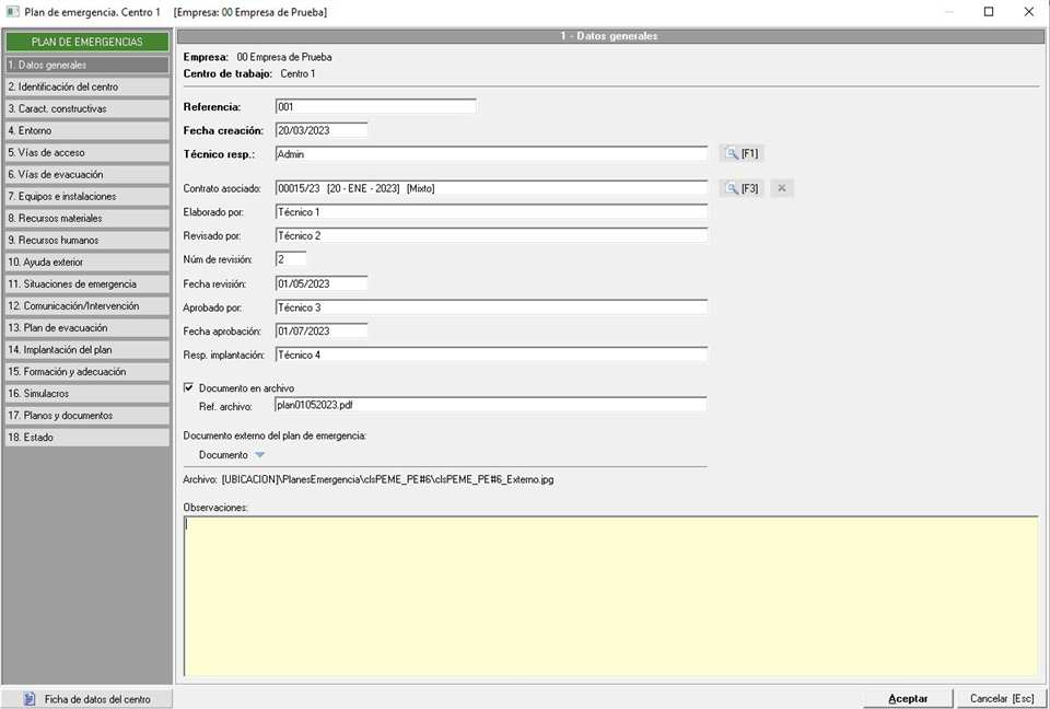 En la parte superior nos indica la empresa (en la que nos encontramos) y el centro seleccionado previamente al que se va a realizar el plan de emergencias. Seguidamente encontramos los únicos campos obligatorios (los que están en negrita) que se corresponden a la Referencia (código alfanumérico que asignamos al Plan), fecha de creación (por defecto la actual aunque se puede modificar) así como el Técnico responsable (usuario de Prevengos que va a realizar este rol).