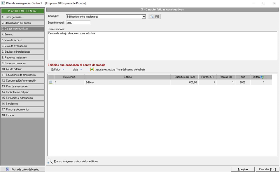 Pestaña donde indicaremos las características constructivas del centro de trabajo, donde se indicarán los edificios y su distribución que componen el centro de trabajo sobre el cual se está realizando el Plan de Emergencias/autoprotección; la cual tiene un aspecto similar a la siguiente imagen: