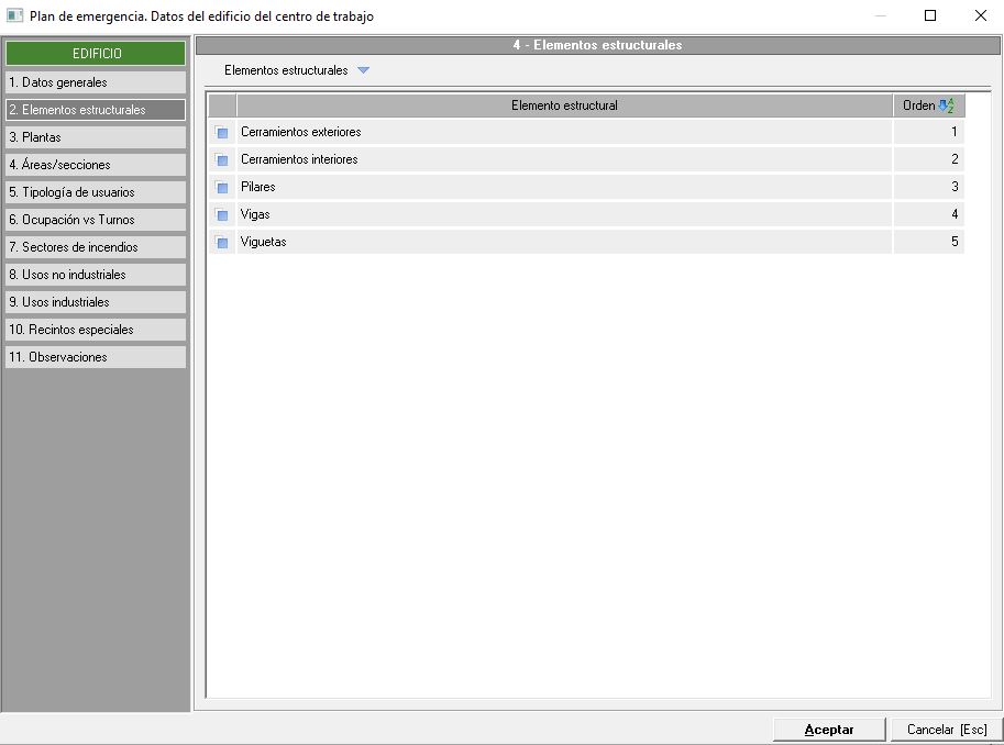 En este caso debemos de añadir los elementos estructurales desde su propio mantenimiento mediante el desplegable "Elementos estructurales". Provienen de un mantenimiento básico en el que simplemente deben estar creados aquellos elementos sin necesidad de indicar ningún tipo de información adicional.