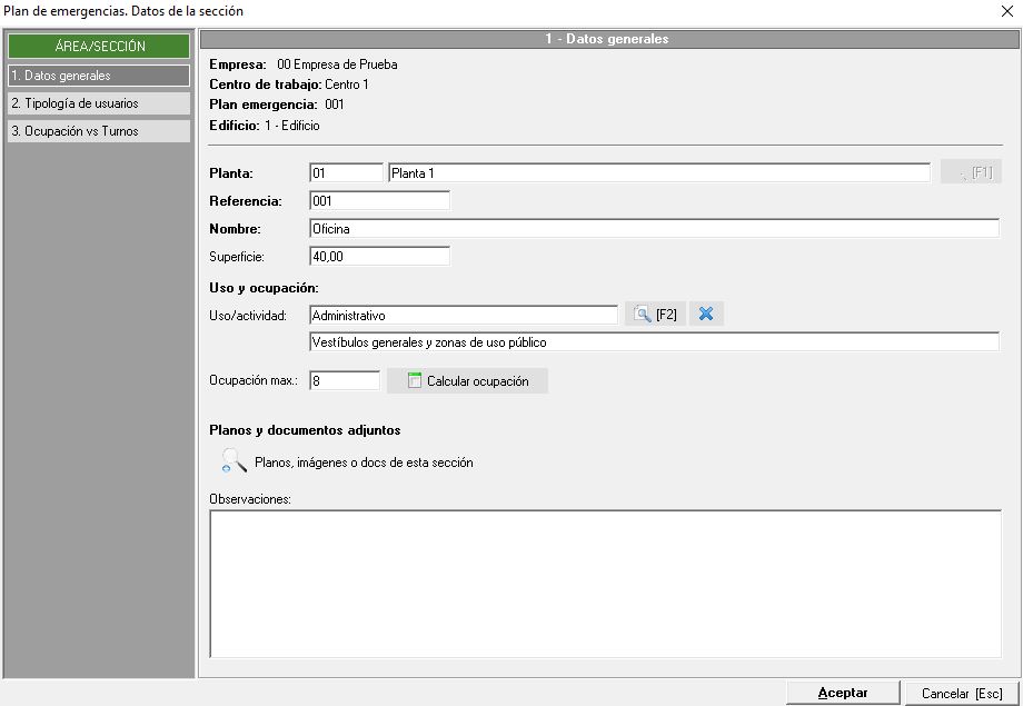 - Datos generales. En este aparatado indicaremos la planta en la que se encuentra la sección que estamos creando, le asignaremos una referencia y un nombre, datos que son de obligada cumplimentación. Seguidamente disponemos del campo de superficie, el cual va ligado al uso y ocupación para que a partir de éste nos calcule la ocupación máxima. Para ello deberá estar configurado, dentro del mantenimiento de uso y ocupación, la cantidad de metros cuadrados por persona. Por último, y como en anteriores pestañas, tenemos disponible la opción de añadir un documento externo así como un campo de observaciones para que el técnico indique información complementaria.