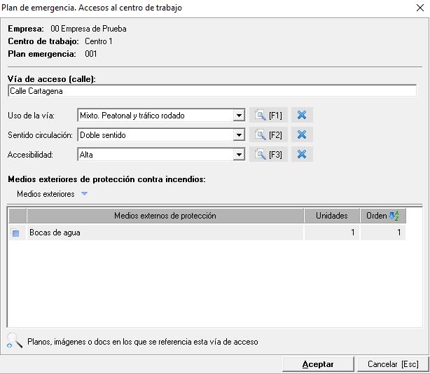 En esta ventana indicaremos el nombre de la vía de acceso, el uso de la misma (peatonal, tráfico rodado, mixta,...), el sentido de circulación (sentido único, doble sentido,...) así como la accesibilidad de la misma (límite de altura de vehículos, anchura,....). Si existe algún medio extintor de protección contra incendias en dicha calle la podemos dar de alta desde el desplegable "Medios exteriores", tal y como puede ser una boca de agua)