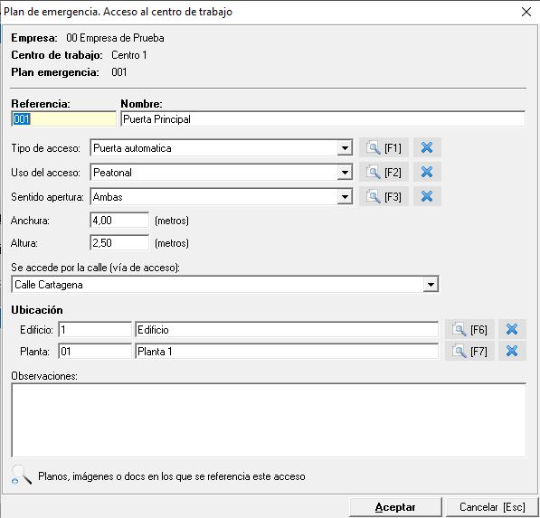 Seguidamente debemos indicar en que calle, de las que hemos creado anteriormente, se encuentra este acceso y, de la misma manera, en que parte del centro (edificio y planta) donde está ubicada. Por último disponemos de un campo de observaciones para indicar cualquier dato relevante.