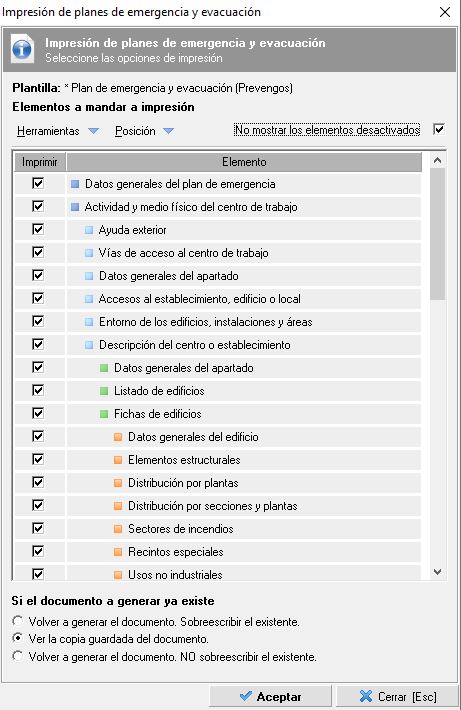 Mientras que en la impresión del plan de emergencias dispondremos de un esquema de impresión donde podemos seleccionar que apartados queremos incluir. En el plan de autoprotección no tendremos esta selección ya que éste busca cumplir con una normativa y por ello los apartados ya están definidos en la plantilla.