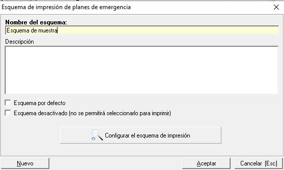 - Seleccionar esquema de impresión. Esta herramienta nos permite tener diferentes esquemas de impresión guardados con el fin de poder seleccionar el que más nos convenga en el momento de la impresión. Una vez seleccionada la opción se muestra el mantenimiento de esquemas de impresión, desde el cual podemos crear/modificar/eliminar cualquiera de ellos. Al crear o editar un esquema se muestra la siguiente ventana: