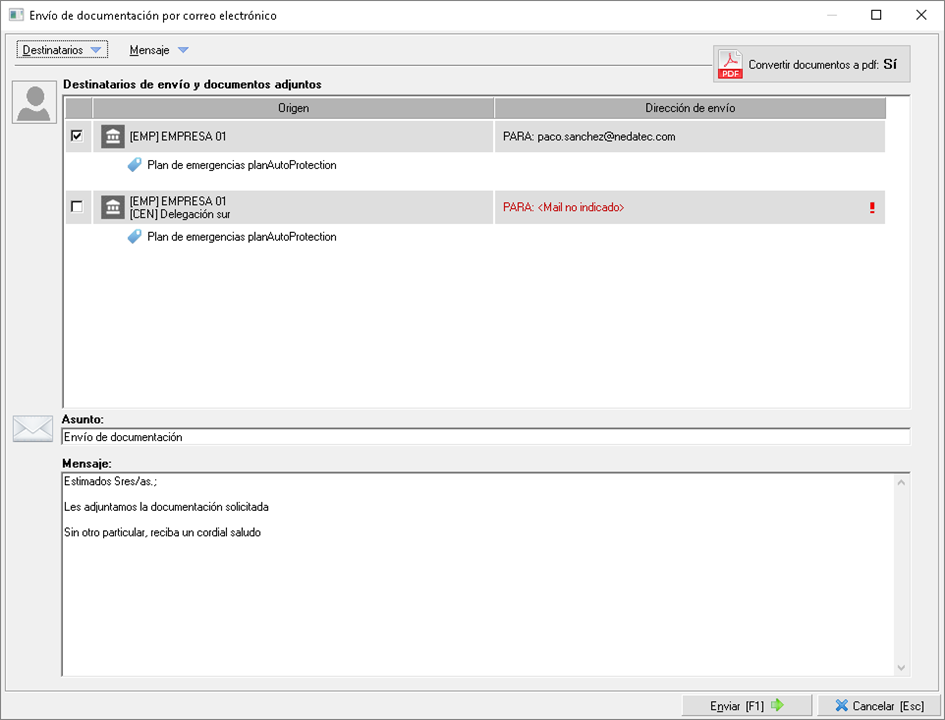 En éste podrá editar los destinatarios por defecto, añadir más destinatarios, configurar la conversión a PDF del documento Word, editar el mensaje...