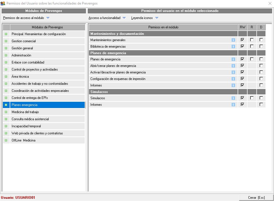 Con este permiso gestionaremos la posibilidad de imprimir los planes de emergencia y autoprotección, así como el listado actual, tal y como vimos en este manual. Con la posición RW permitiremos al usuario generar estos documentos mientras que se lo denegaremos con la posición D.