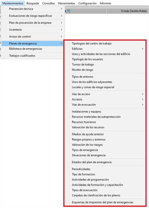 Gestiona el acceso a todos los mantenimientos generales relacionados con los plantes de emergencia. Con RW se permite el acceso y crear/editar/eliminar elementos, con R se puede acceder en solo lectura sin poder modificar datos y con D el acceso es denegado. En la siguiente imagen podemos ver los mantenimientos afectados por este permiso, accesibles desde el módulo de prevención técnica: