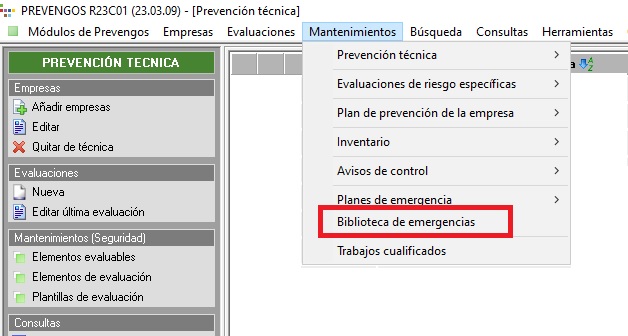 Gestiona el acceso a [Biblioteca de emergencias] ubicado en el menú superior [Mantenimientos] del módulo de prevención técnica, tal y como podemos ver en la imagen inferior. Con RW se permite el acceso y crear/editar/eliminar elementos, con R se puede acceder en solo lectura sin poder modificar datos y con D el acceso es denegado