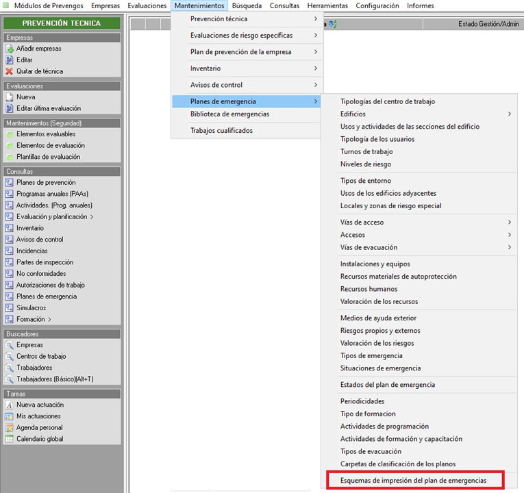 Gestiona el acceso al mantenimiento de esquemas de impresión de los planes de emergencia. Dicho acceso lo tenemos disponible dentro de los mantenimientos relacionados con los planes de emergencia, en concreto lo podemos ver señalado en la siguiente imagen: