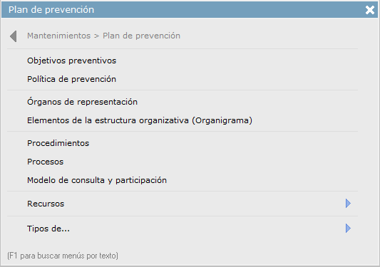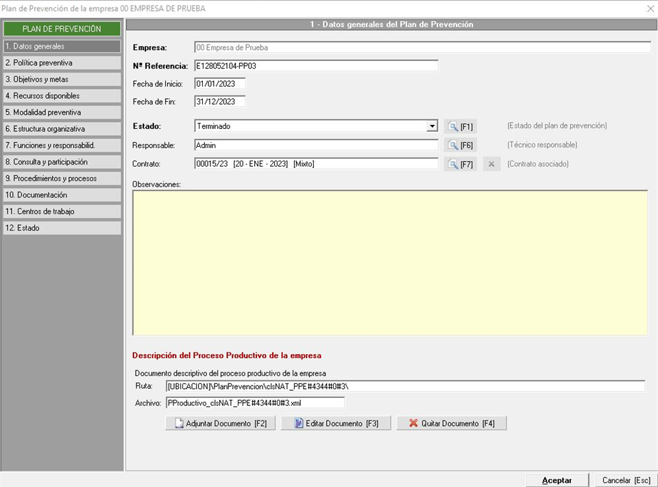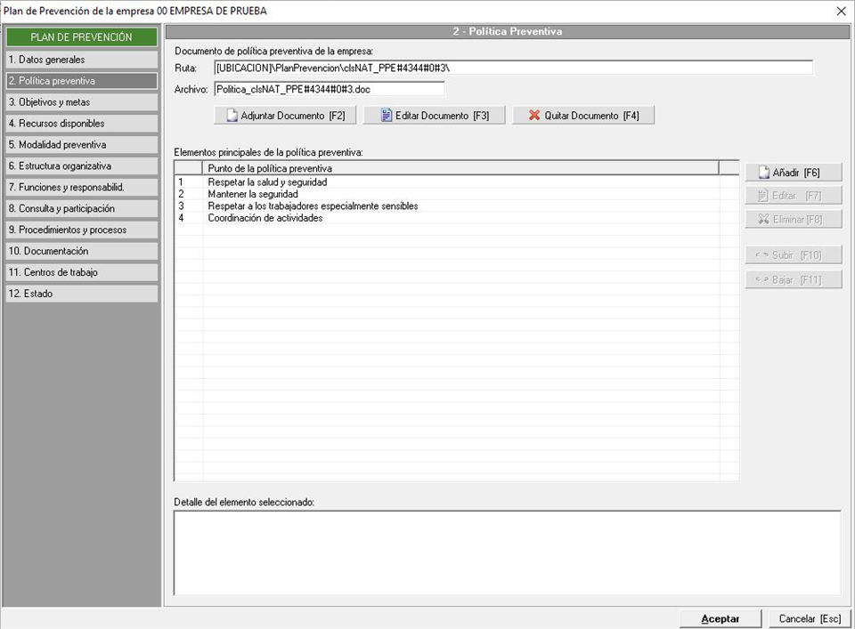 Apartado donde indicaremos la política preventiva de la empresa, para lo que podemos hacerlo de dos maneras, o bien con un documento externo o añadiendo los elementos directamente desde el mantenimiento, tal y como podemos ver en la siguiente imagen:
