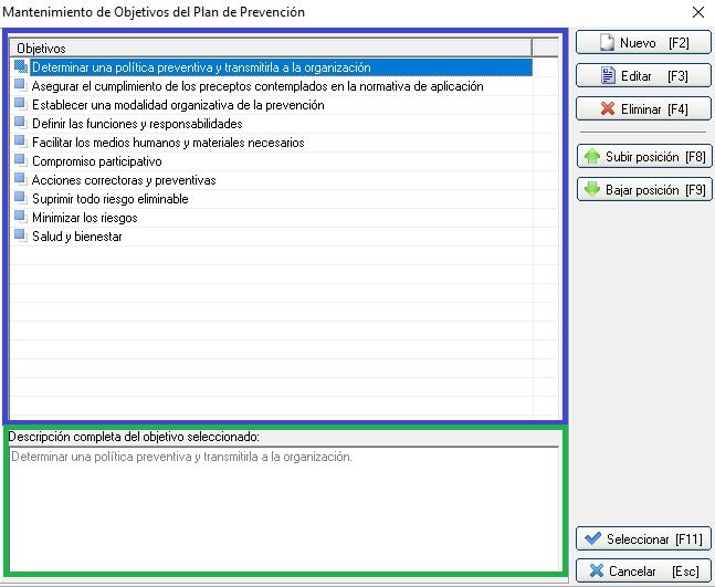 Podemos apreciar en este mantenimiento que disponemos de dos partes. En la parte superior disponemos de los objetivos del Plan de prevención y cuando seleccionamos uno se nos muestra en la parte inferior la descripción completa. Cuando damos de alta o editamos un elemento de este mantenimiento podemos indicar una descripción para cada objetivo o meta, de tal manera que será impresa en el momento de generar el documento del Plan de Prevención.