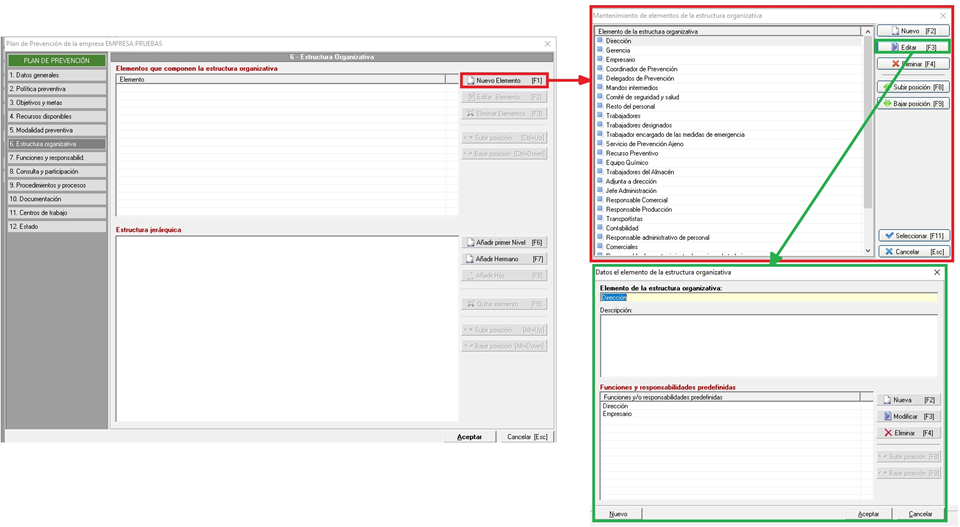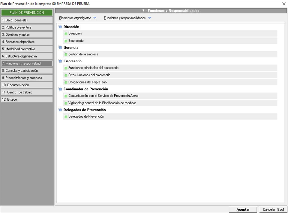 Dentro de este apartado vamos a introducir las funciones y responsabilidades en función de los elementos que hayamos insertado en el apartado anterior, dentro de la estructura organizativa. Recordemos, tal y como vimos en este punto, que los elementos que componen la estructura organizativa pueden estar relacionados, en el mantenimiento, con las funciones y responsabilidad propias.