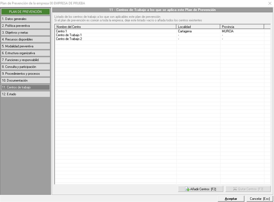 En esta pestaña indicaremos los centros de trabajo existentes en la empresa que están incluidos en el plan de prevención. La pestaña que se nos muestra es similar a la siguiente imagen: