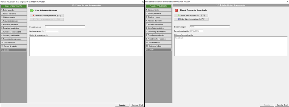 Un plan de Prevención puede tener estado de activo o desactivado, por ello podemos ver en la imagen izquierda en el que el elemento está activo. En la imagen de la derecha vemos como sería la pantalla en caso de estará desactivado, teniendo en cuenta que al hacerlo Prevengos nos solicitará la fecha y el motivo de cierre, los cuales se muestran en esta imagen.