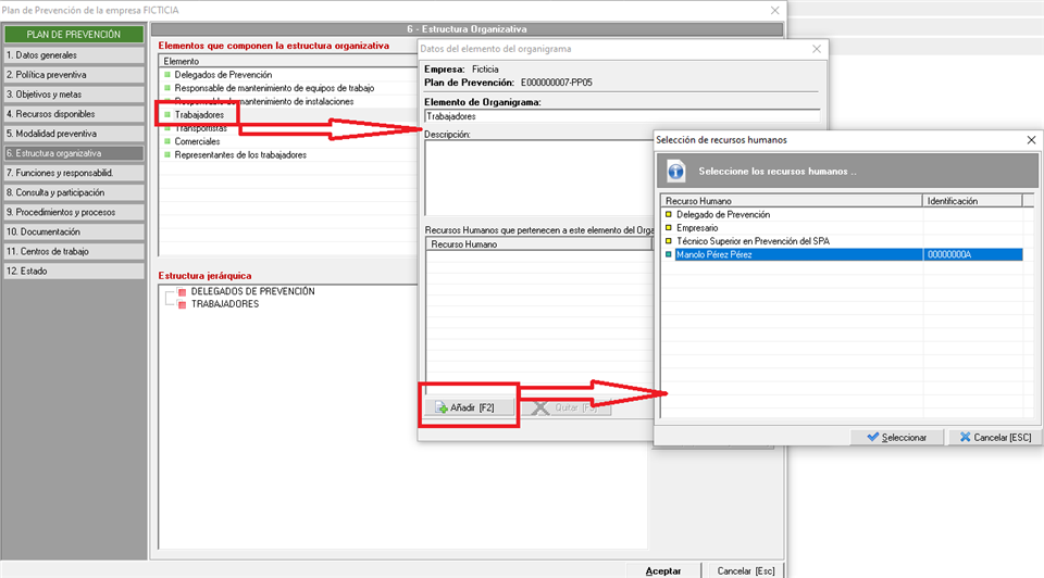 Por último, tendremos la posibilididad de identificar cada uno de los componentes con los recursos humanos disponibles en el plan. Abriendo los datos de cualquiera de los componentes que conforman la estructura organizativa, se nos habilitará una opción de “Añadir [F2]” en la que podremos seleccionar los distintos recursos humanos que hayamos incluído en el plan.