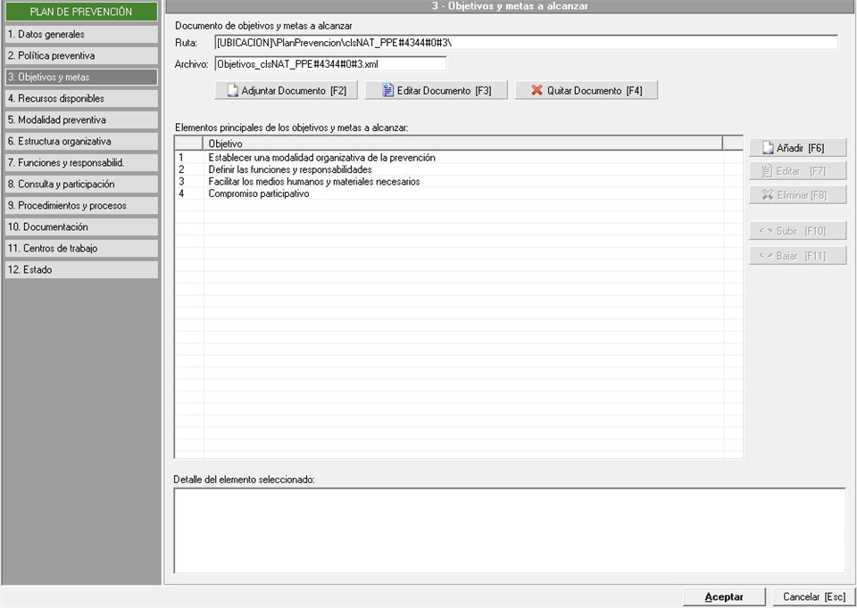 Esta pestaña tiene el mismo aspecto que la anterior y en este caso indicaremos los objeticos y metas que persigue el Plan de Prevención. De la misma manera que en el punto anterior podemos hacerlo de dos maneras diferentes, con un documento externo o añadiendo los elementos directamente desde el mantenimiento, tal y como podemos ver en la siguiente imagen: