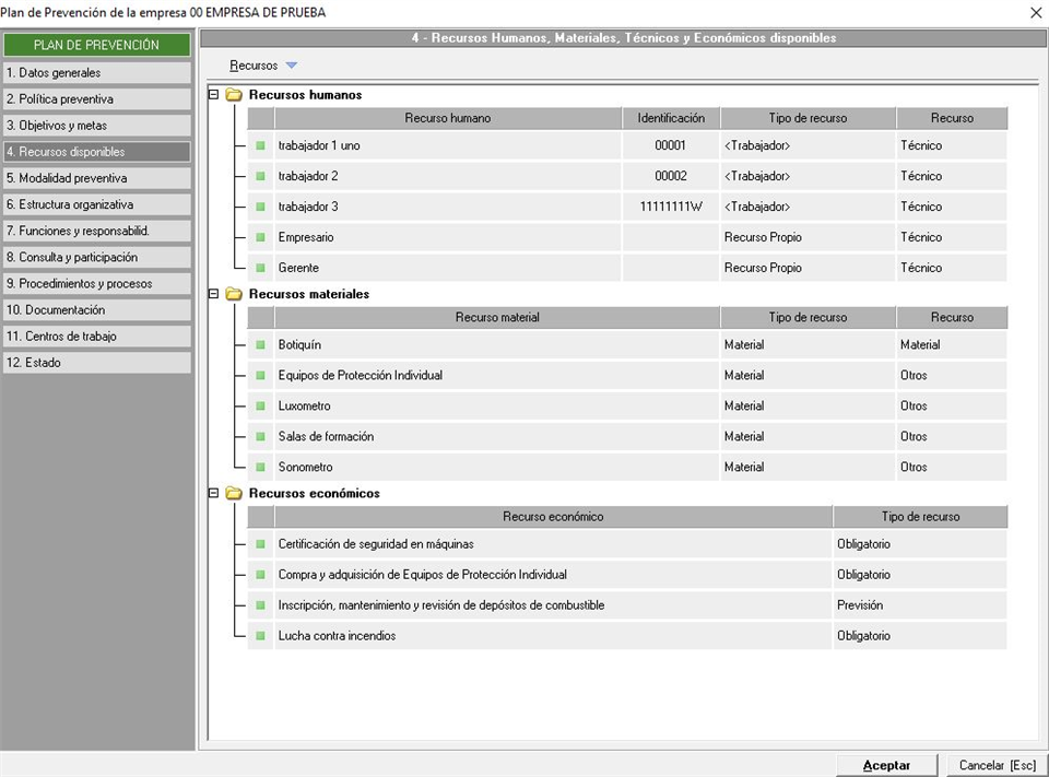 En este apartado vamos a indicar los recursos disponibles para el Plan de Prevención. Estos recursos pueden ser económicos (proveniente de un mantenimiento), recursos materiales (proveniente de un mantenimiento) y recursos humanos (pueden añadirse desde un mantenimiento y/o desde los trabajadores de la empresa). La pantalla que se nos muestra es similar a la siguiente imagen: