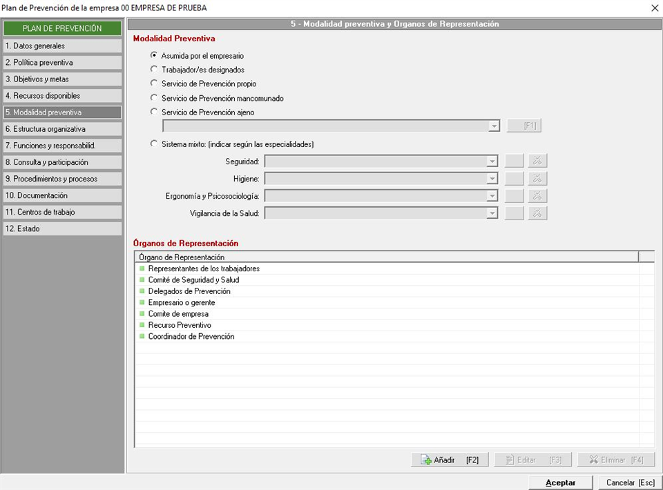 Apartado donde indicaremos todo lo referente quien asume la modalidad preventiva y los órganos de representación, en una pestaña similar a la siguiente imagen: