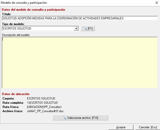 Dentro de este apartado añadiremos los modelos de documentos relacionados con la consulta y participación en el plan de prevención. Se mostrará en una ventana similar a la siguiente imagen: