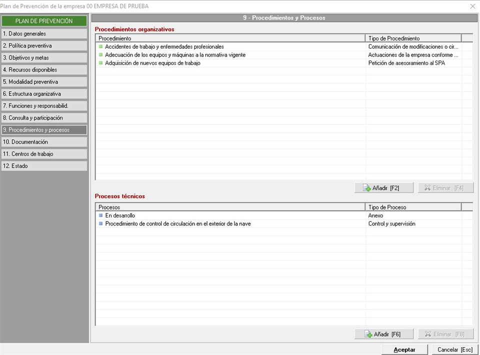 En esta pestaña indicaremos todo lo referente a procedimientos organizativos y procesos técnicos que queremos incluir en el plan de prevención. El aspecto visual es similar a la siguiente imagen.