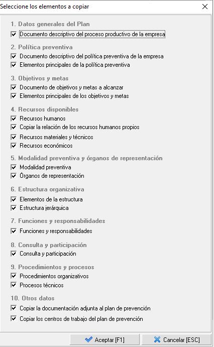 Está opción la emplearemos cuando queramos duplicar un plan de Prevención en la misma empresa. Para ello, seleccionaremos el Plan que queremos duplicar y ejecutaremos esta herramienta. Tras lanzar la herramienta se muestra una ventana para que podamos elegir que elementos queremos copiar u omitir, similar a la siguiente imagen: