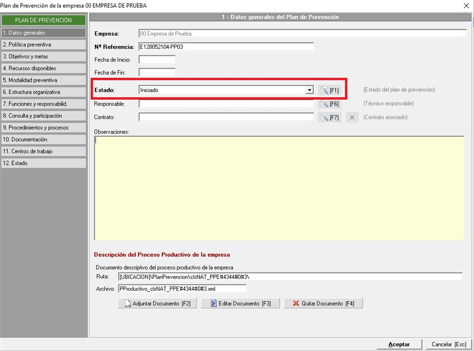 Recordemos que en la pestaña "1. Datos Generales" del Plan de Prevención disponemos de un campo, obligatorio, donde indicamos el estado del propio Plan, tal y como podemos ver en la siguiente imagen: