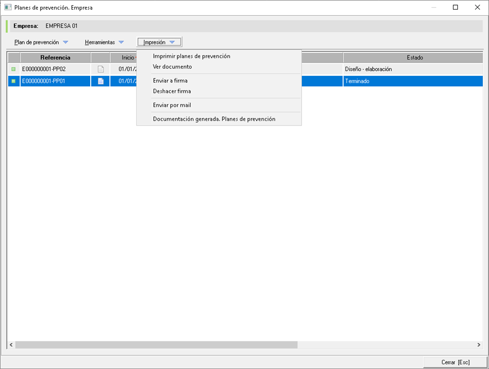 En este manual nos vamos a centrar en el menú Impresión que encontramos dentro del apartado dedicado a los Planes de Prevención, tal y como vemos en la siguiente imagen: