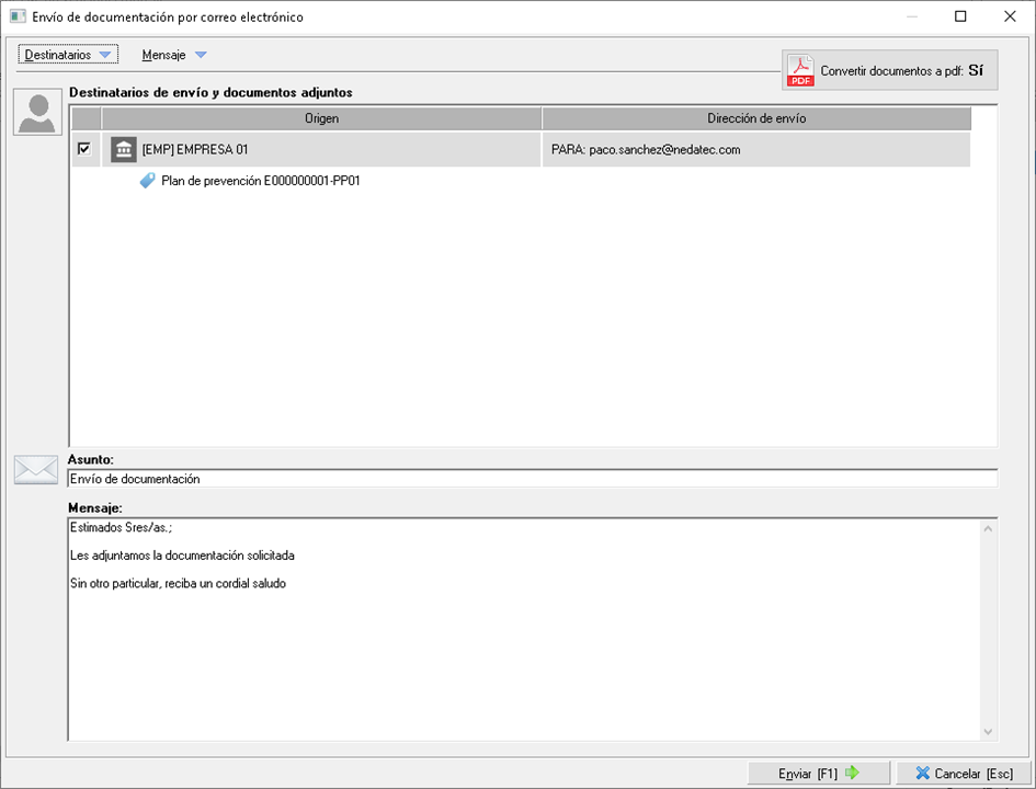 En éste podrá editar los destinatarios por defecto, añadir más destinatarios, configurar la conversión a PDF del documento Word, editar el mensaje...