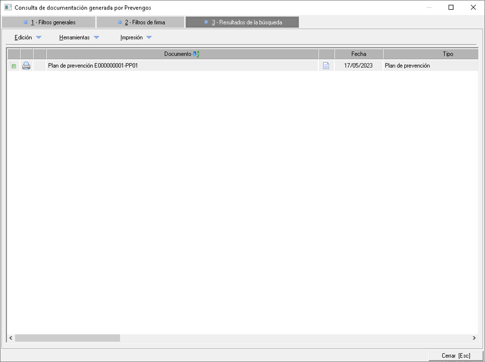Devuelve un listado, mediante la consulta Consulta de documentos generados por Prevengos, con todos los documentos generados de Planes de prevención para la empresa.