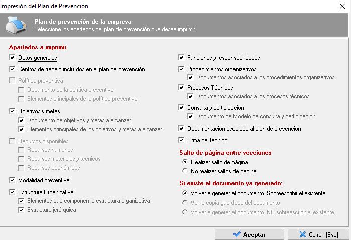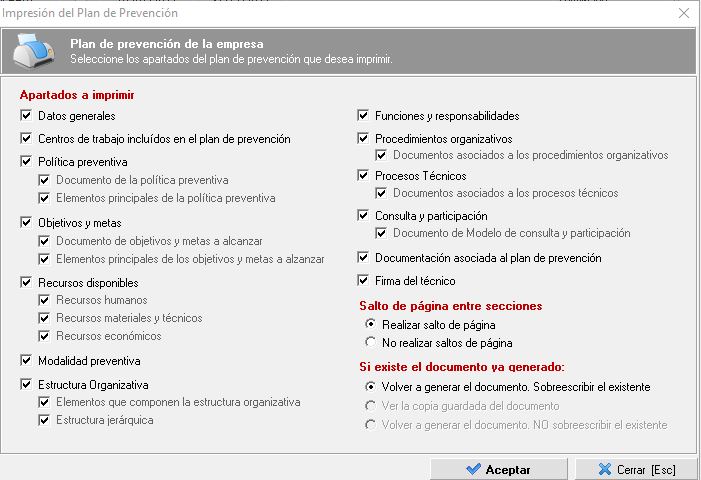 Esta opción la utilizaremos para generar el informe del plan de prevención en word. Utilizada esta opción se muestra un esquema de impresión donde puede elegir los apartados que desea incluir en el informe, de manera similar a la siguiente imagen:
