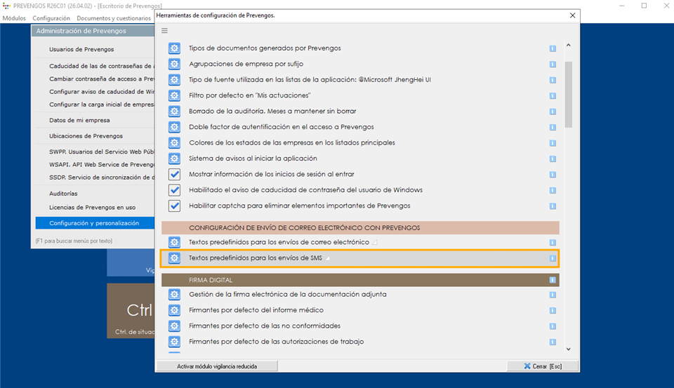 Para su configuración ha de acceder al formulario Herramientas de configuración de Prevengos, y al bloque CONFIGURACIÓN DE ENVÍO DE CORREO ELECTRÓNICO CON PREVENGOS, con el menú Configuración > Configuración de Prevengos.