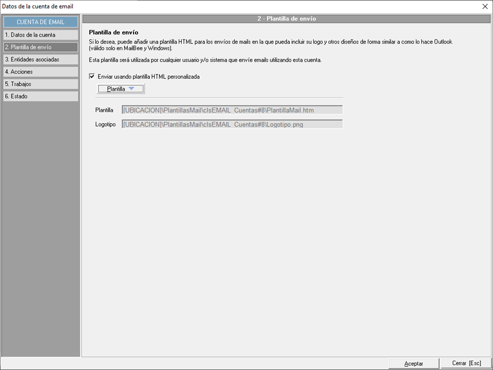 Para configurar la firma debe acceder a la pestaña 2. Plantilla de envío, en ficha de datos de la cuenta de correo en cuestión, y habilitar la casilla Enviar usando plantilla HTML personalizada.