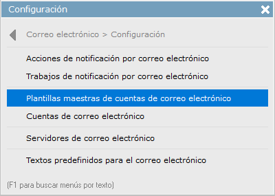 Para acceder al mantenimiento de las cuentas maestras, los usuarios con permisos de administrador deben acceder a través del menú Correo electrónico > Configuración > Plantillas maestras de cuentas de correo electrónico, desde el escritorio de Prevengos.