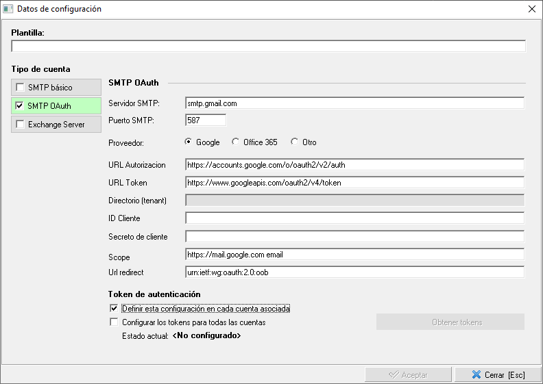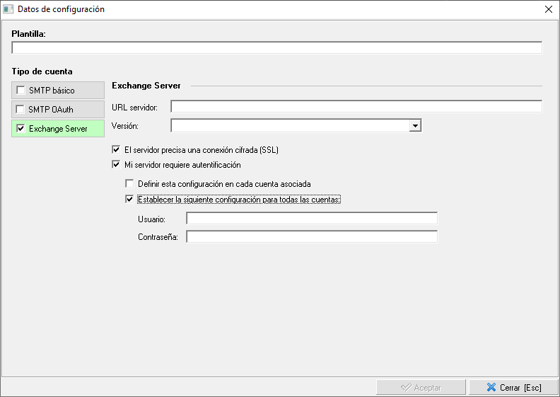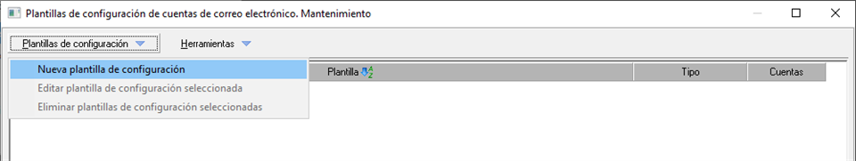 Desde el formulario del mantenimiento, tendrá que usar el menú Plantillas de configuración > Nueva plantilla de configuración, para crear la plantilla según el tipo: SMTP básico, SMTP OAuth y Exchange Server.