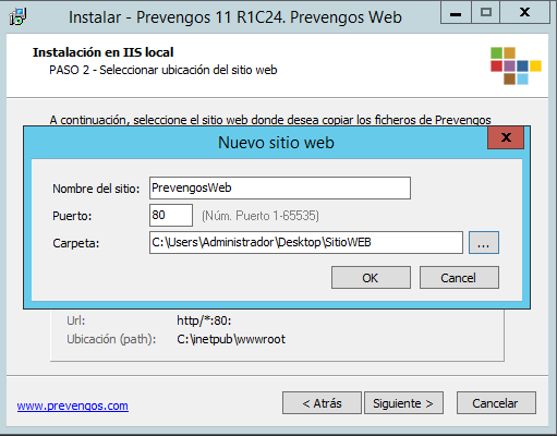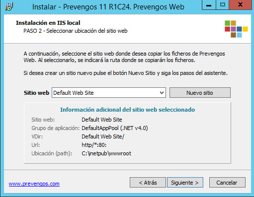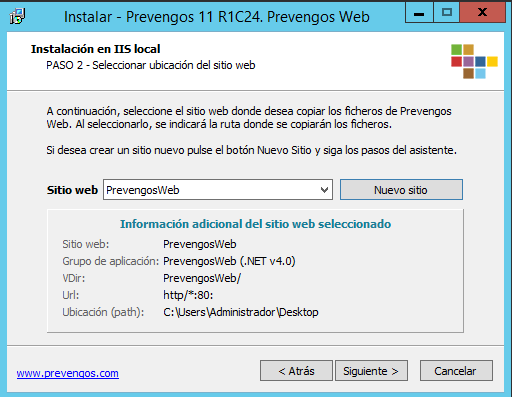 En el siguiente paso seleccionamos el sitio web e indicamos la ruta en la que deseamos copiar los ficheros de Prevengos Web o el portal que estemos instalando. En caso de que en el desplegable no aparezcan los sitios Webs del IIS porque no los hemos creado tal y como se explica en el apartado "Configuración del IIS" de este manual, podemos crear el nuevo sitio Web con el puerto que consideremos oportuno y la carpeta en la que queramos que se generen los ficheros.