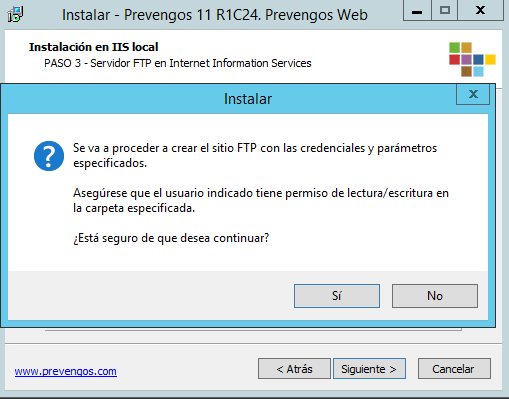 Ahora procedemos a la instalación del sitio FTP necesario para la publicación de documentación. Importante recordar que esta instalacion no sera necesaria hacerla en el caso de que ya tengamos creado el servidor FTP de Prevengos en el IIS.
