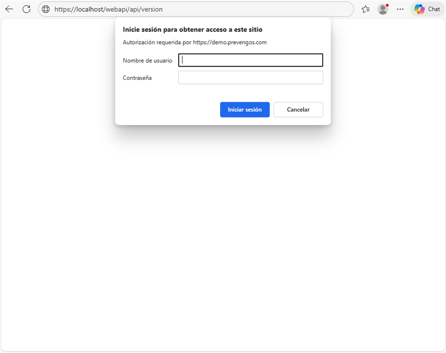 En el caso de la comprobación de la API de Prevengos accederemos a la URL indicada y nos pedirá un usuario y contraseña de la API los cuales habremos configurado en Prevengos.