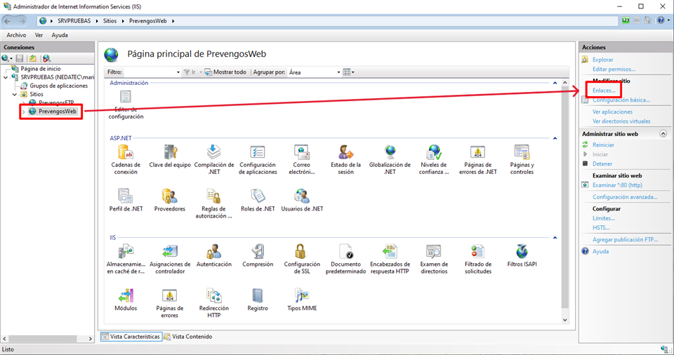 Una vez que tengamos el certificado IIS instalado y localizado en el equipo accedemos al servidor IIS, seleccionamos el sitio principal de la Web de Prevengos y accedemos a los enlaces del sitio desde el menú de la derecha.