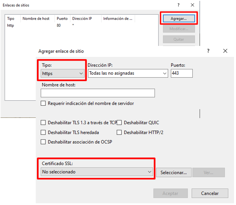 En la ventana que se abre clicamos en “Agregar”. En la nueva ventana seleccionamos el tipo “https” y en la parte de abajo seleccionamos el certificado instalado previamente en el equipo.