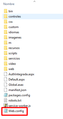 El siguiente paso es modificar la configuración del fichero ‘WebConfig’ de los portales web instalados. Estos ficheros, se encuentran en los directorios de instalación de los portales web.