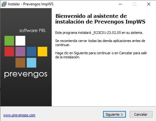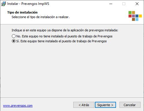 Paso importante en el que tenemos que seleccionar si el equipo donde está el servicio de impresión, y donde lo estamos actualizando, tiene o no instalado el puesto de trabajo de Prevengos. El servicio necesita de unos componentes internos para funcionar, los cuales son comunes con los que se instalan junto al puesto de trabajo, por ello debemos indicar si el ordenador tiene o no el puesto de trabajo instalado para que el asistente instale o no estos componentes. Si no vemos el acceso a Prevengos (en el escritorio o en el menú inicio) deberemos indicar que no está el puesto de trabajo. En la mayoría de las ocasiones el puesto de trabajo suele estar instalado, ya que se reutiliza el mismo servidor de datos o servidor web para instalar el servicio de impresión. Una vez marcada la opción correspondiente pasaremos a la siguiente pantalla del asistente con el botón