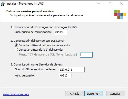 - SERVIDORSQL: Hay que indicar el modo de conexión con la base de datos establecido durante la instalación de Prevengos. O NOMBRE o IP.