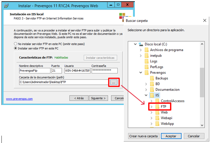 En el campo “Carpeta de la documentación (path)” clicaremos en el botón con los 3 puntitos y seleccionaremos la carpeta FTP creada dentro de la carpeta IIS.