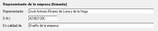 La información sobre el firmante carga por defecto los datos del bloque Responsable de la empresa, de la pestaña 2. Datos de contacto, en la ficha de datos de la empresa. Debe tener en cuenta que si dispone del módulo de firma externa y manda este a firmar, este será el firmante al que se le mandará el documento.